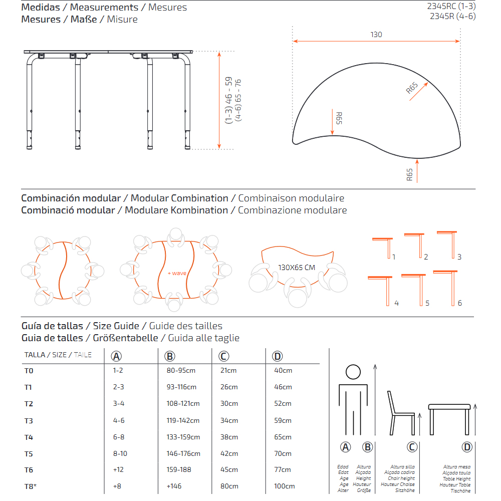 - Combinando dos mesas Yang, obtenemos la mesa escolar YANG DUO, con espacio para 6 alumnos.