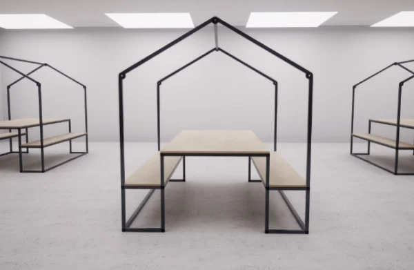 Diseño icónico y funcional: Estructura metálica en forma de casa que crea un espacio reconocible, acogedor y sin barreras físicas.