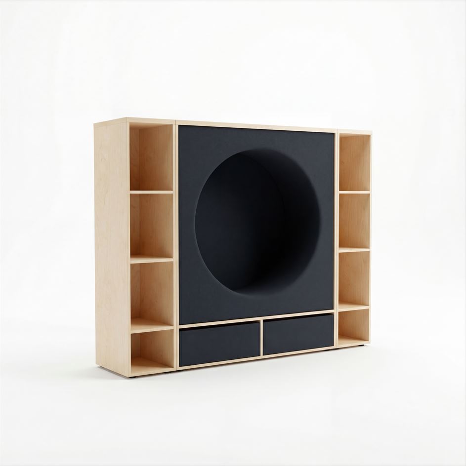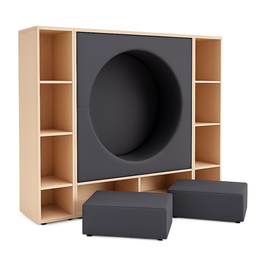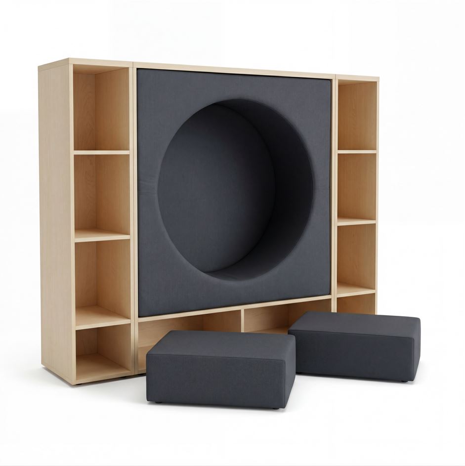 Su diseño crea un pequeño refugio dentro del entorno educativo. La zona central acolchada con forma circular genera un espacio envolvente donde los alumnos pueden sentarse, leer o descansar, mientras que los módulos laterales permiten organizar libros, cuentos o material educativo de forma accesible.