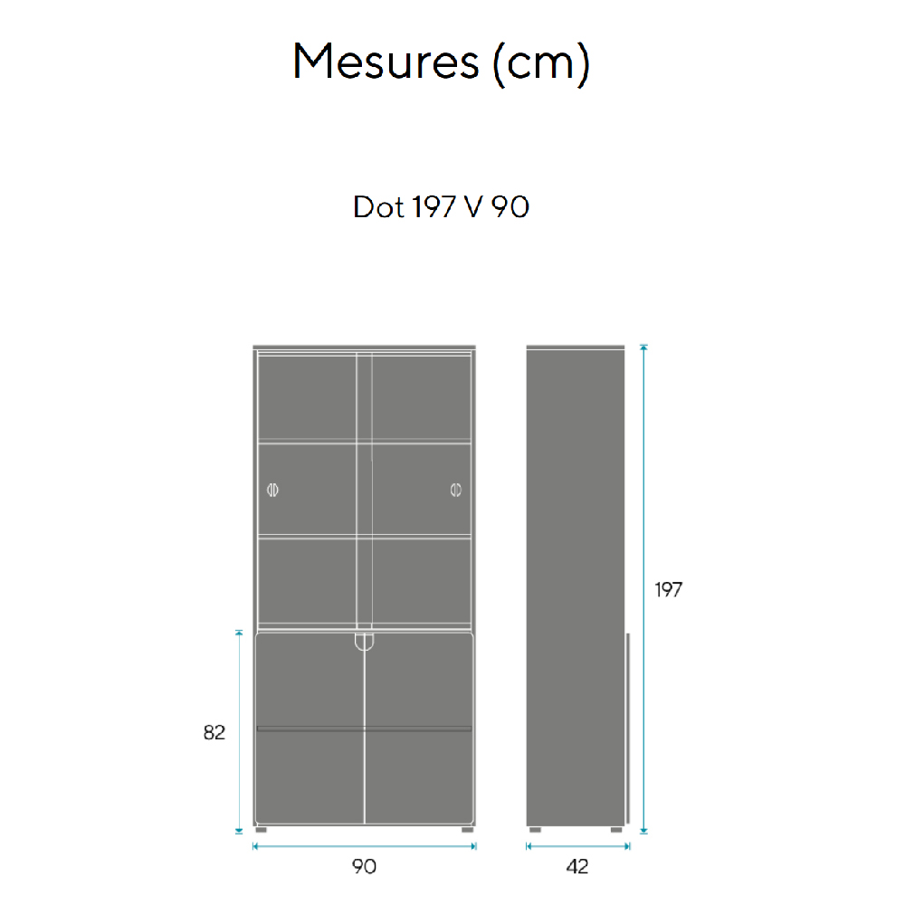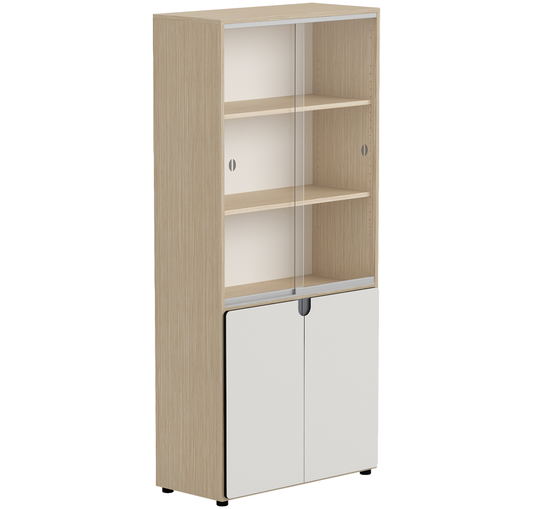 Con una altura de 197 cm, esta vitrina está estructurada en dos zonas diferenciadas: una parte superior acristalada ideal para exhibir materiales, y una parte inferior con puertas opacas y cerradura para guardar objetos de forma segura.